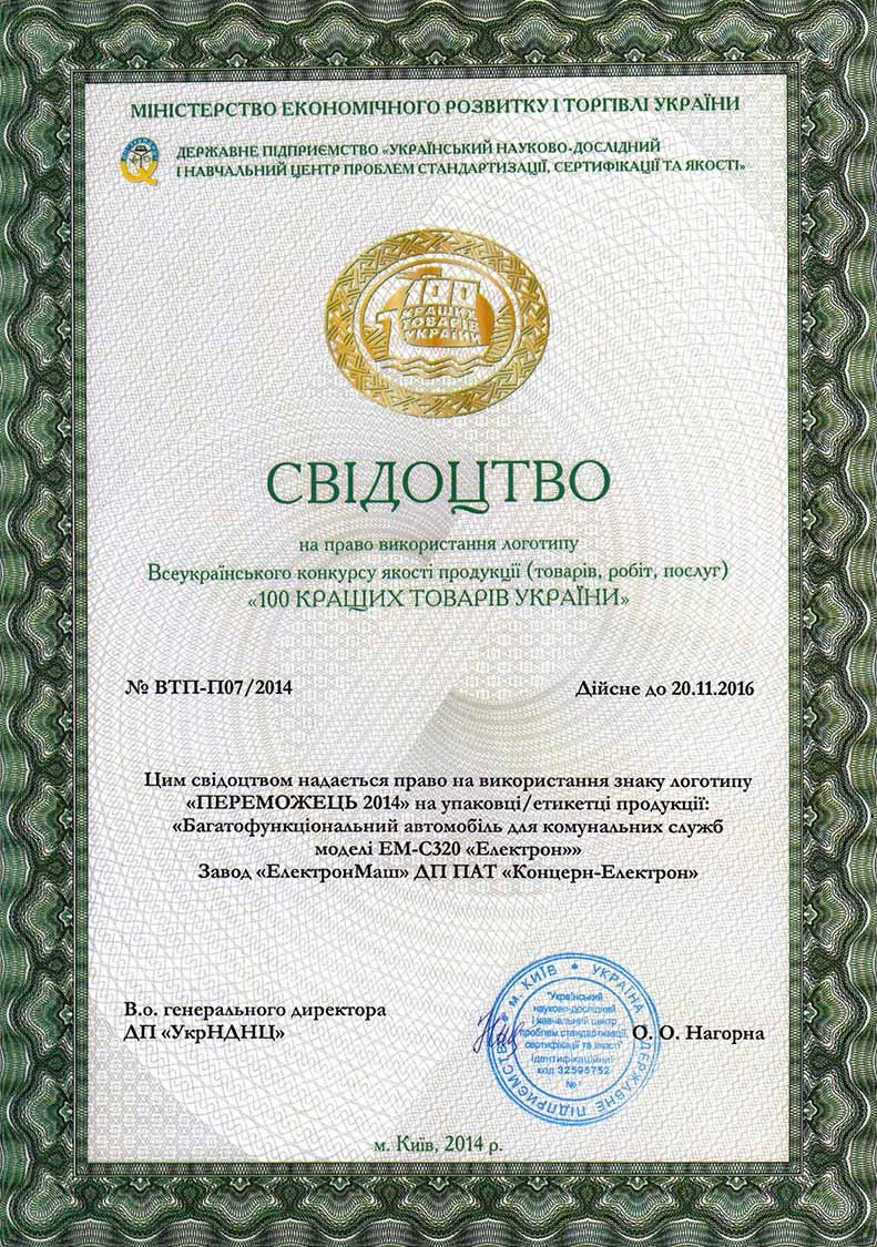У цьогорічному Всеукраїнському конкурсі якості продукції (товарів, робіт, послуг) – «100 кращих товарів України» були представлені кращі зразки продукції українських виробників різних галузей економіки, в тому числі машинобудування.