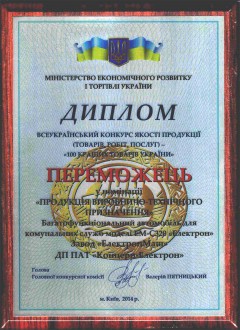 20 листопада цього року в клубі Кабінету Міністрів України почесну відзнаку та диплом переможця нашому підприємству вручили заступник Міністра економічного розвитку і торгівлі України – керівник апарату Роман Качур та директор департаменту технічного регулювання та метрології Міністерства економічного розвитку України Леонід Віткін.